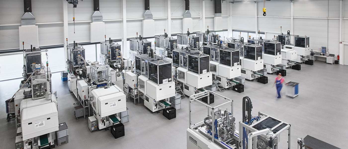 Fertigung auf 85 Arburg Spritzgießmaschinen, davon über 50 mit vollautomatischer Gewebebestückung; 350 Mitarbeiter.
